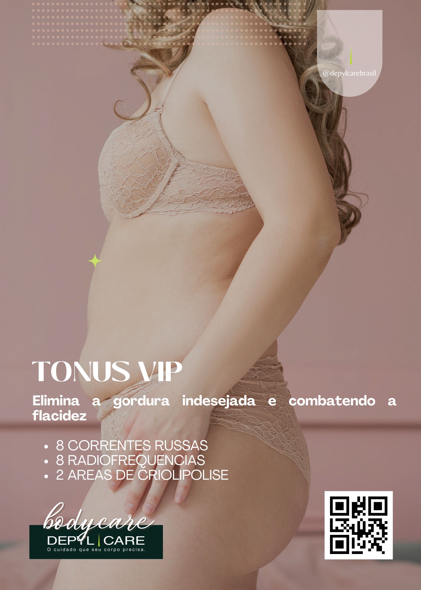 O Pacote TONUS VIP da DEPYL CARE é a escolha perfeita para quem deseja conquistar um corpo tonificado e definido, eliminando a gordura indesejada e combatendo a flacidez. Este pacote é ideal para homens e mulheres que buscam resultados efetivos e duradouros na modelagem do corpo, promovendo uma silhueta mais esculpida e uma pele mais firme. Com uma combinação de tratamentos inovadores, o Pacote TONUS VIP transforma a estética corporal e eleva a autoestima.