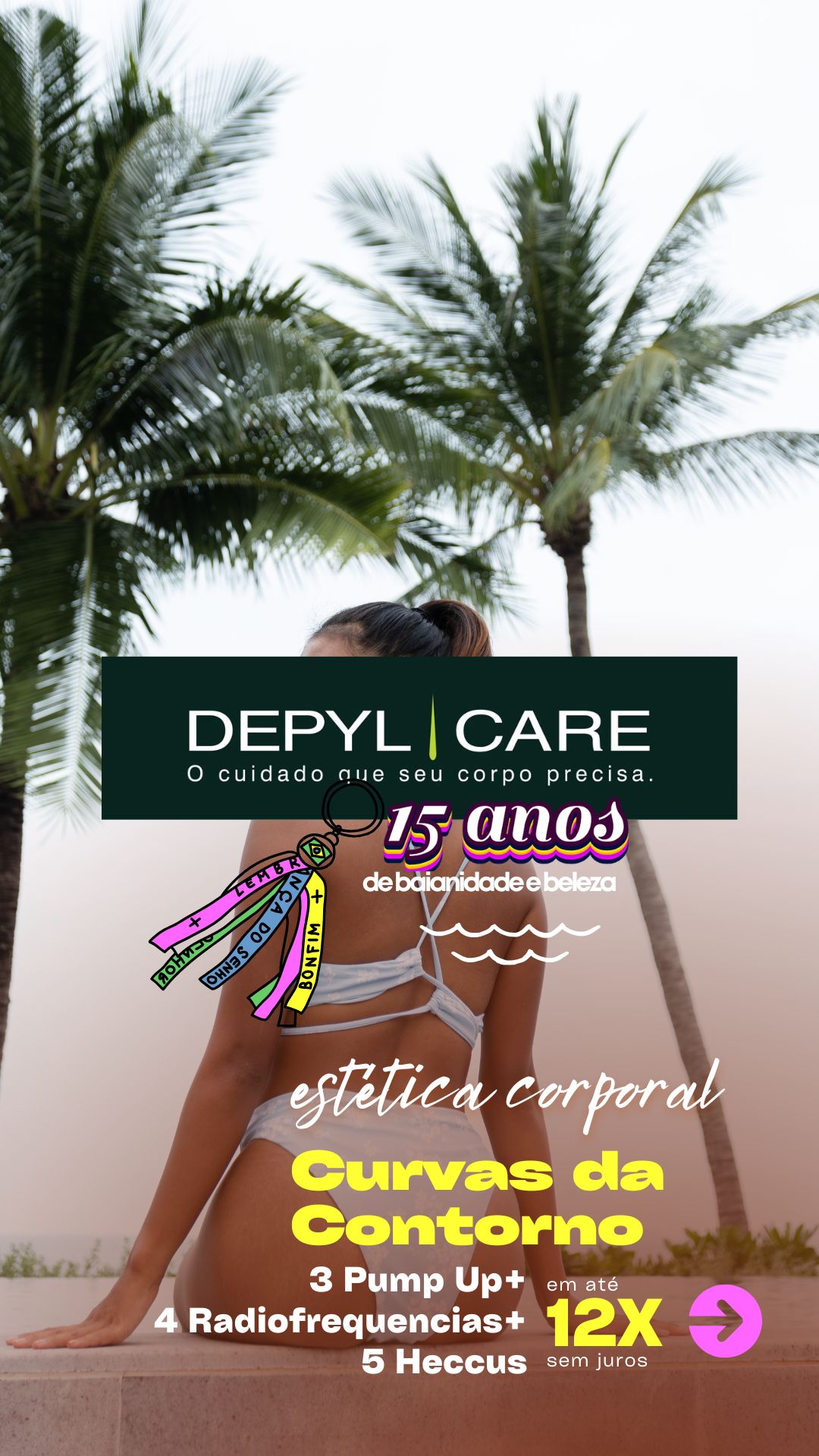 Em celebração aos 15 anos da DEPYL CARE, apresentamos o pacote "Curvas da Contorno". Composto por 3 sessões de Pump Up, 4 sessões de Radiofrequência e 5 sessões de Heccus, esse tratamento exclusivo visa melhorar o contorno corporal, tonificar a pele e combater a flacidez, oferecendo resultados visíveis e duradouros com a qualidade que só a DEPYL CARE proporciona.